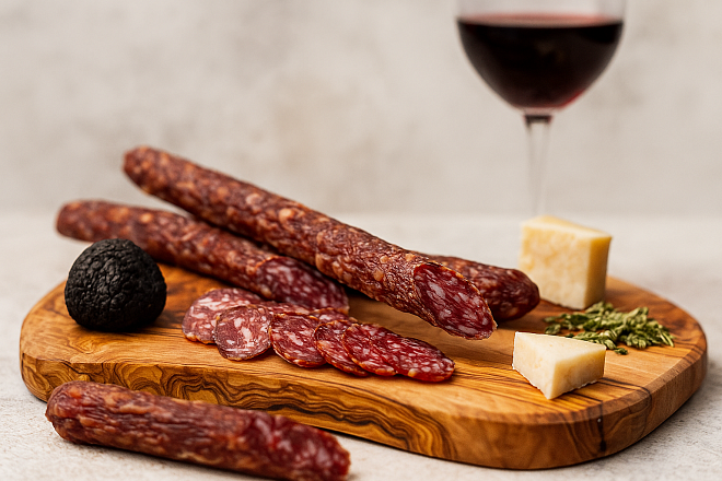 Прошутто с чёрным трюфелем — деликатес с утончённым вкусом для сыра и особых моментов.