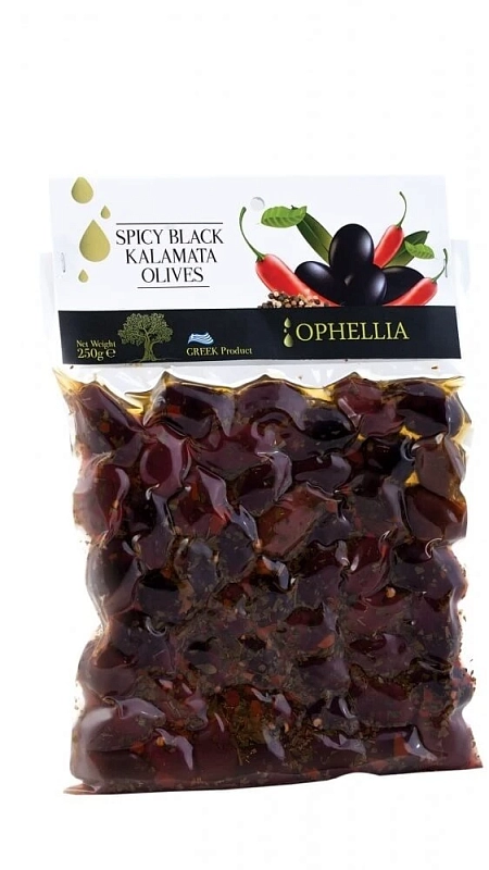 Ассорти греческих оливок Каламата со специями в вакуумной упаковке.