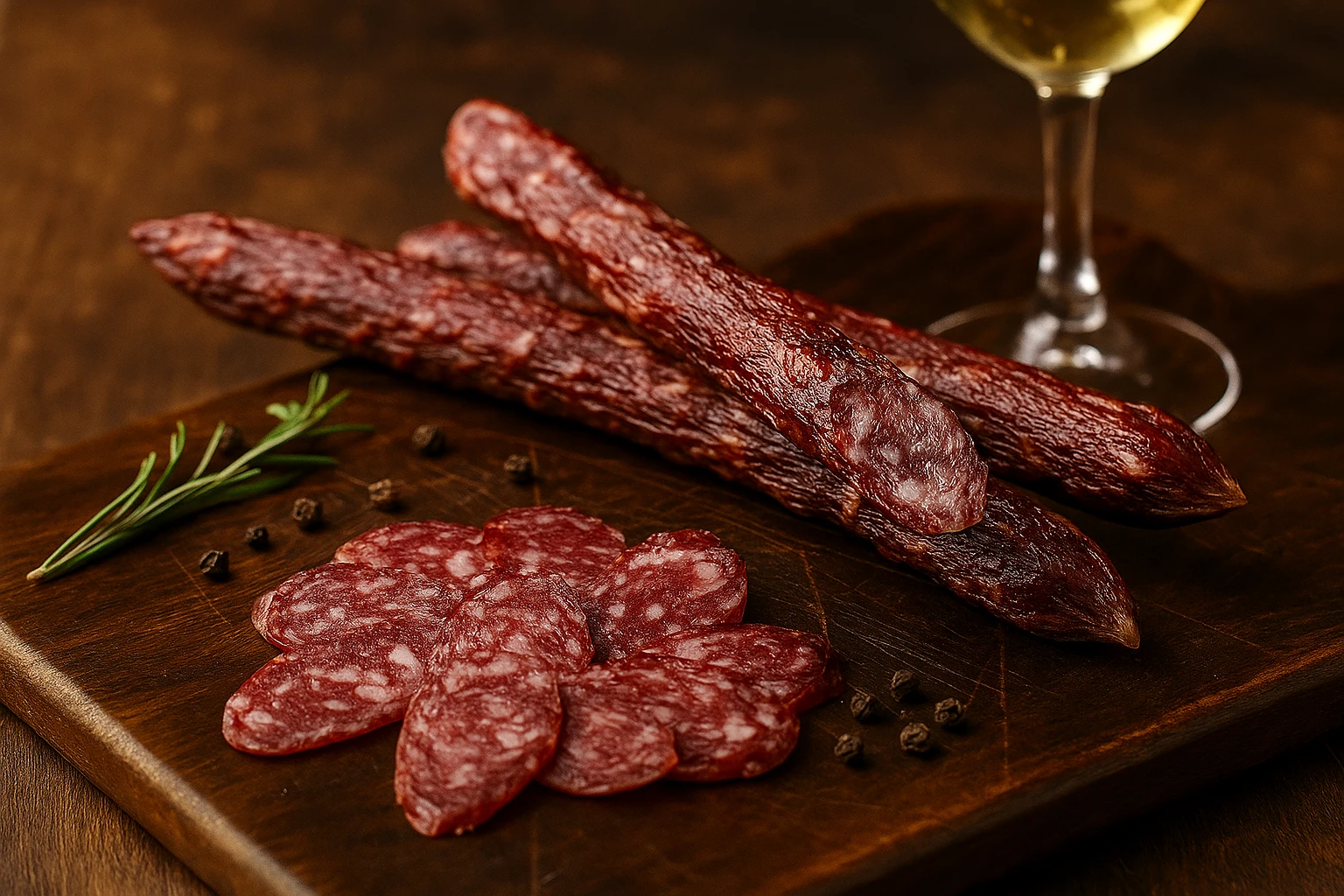 Сыровяленая колбаса с белой плесенью и карри — пряный деликатес с тёплым характером.