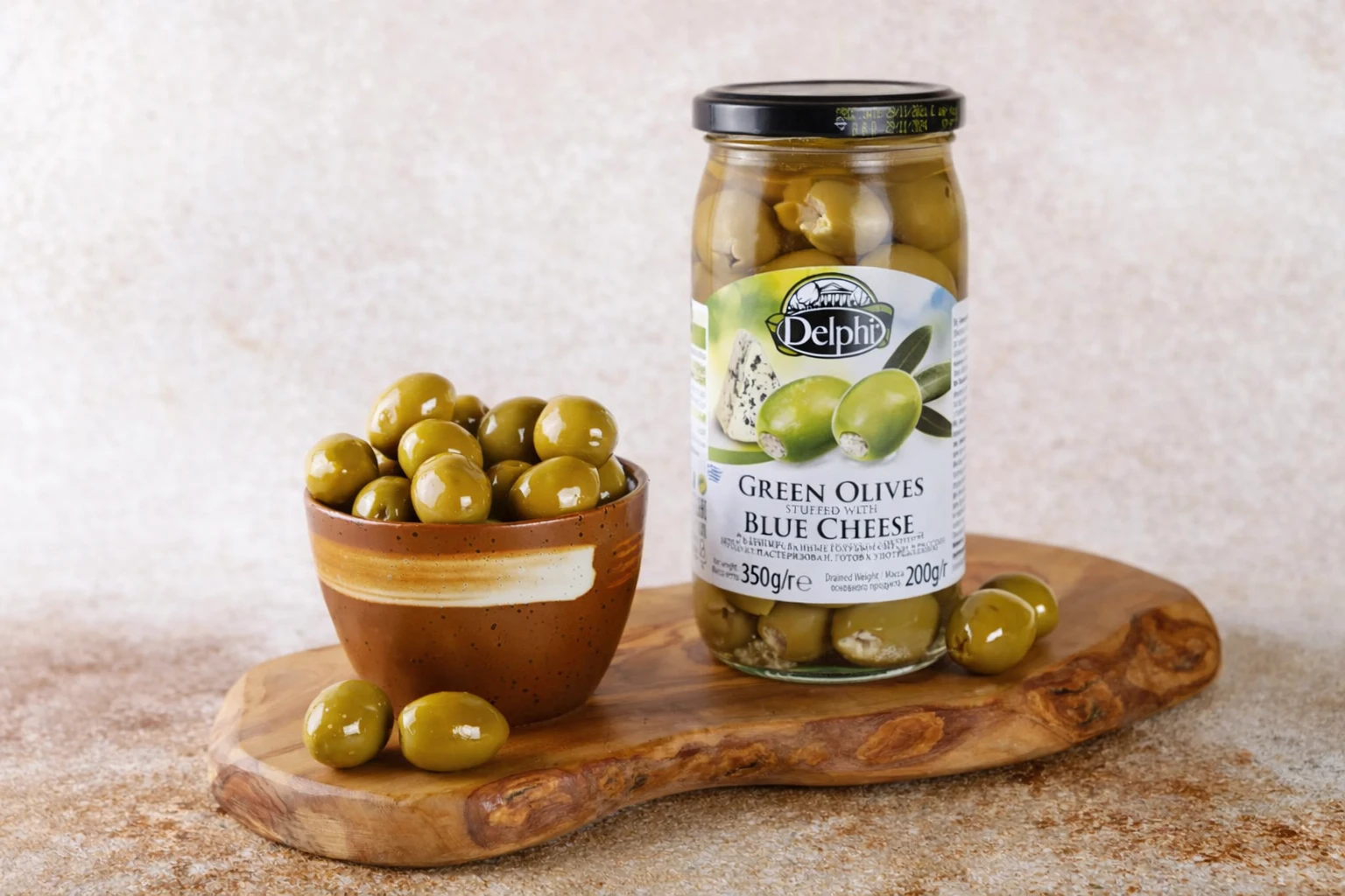 Отборные зелёные оливки наполняются насыщенным голубым сыром с характерной пикантностью и сливочной глубиной. Такое сочетание создаёт многогранный вкус: мягкая солоноватость оливки плавно переходит в выразительные, чуть острые сырные ноты.
