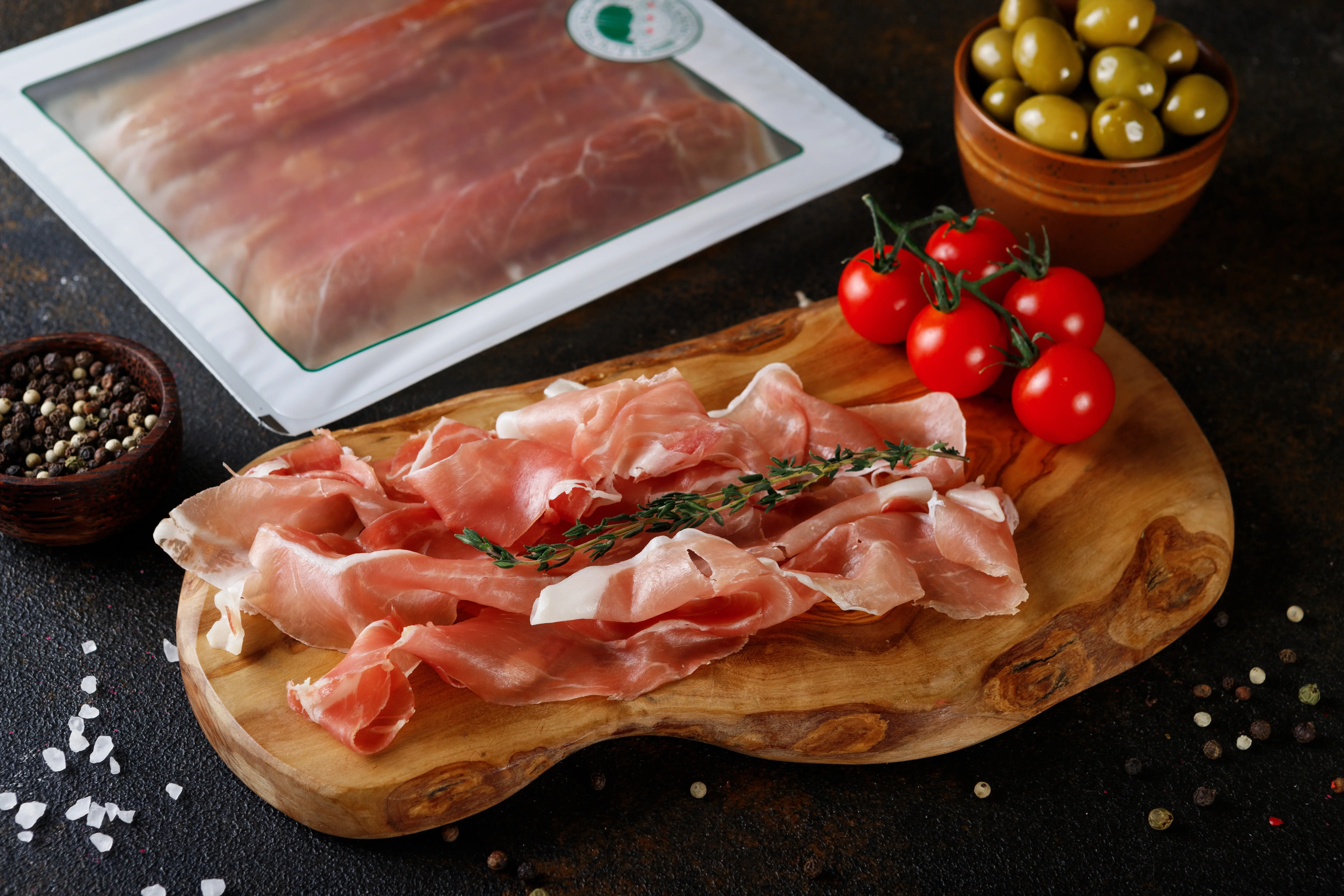 Итальянское прошутто — выдержанный окорок с тонким вкусом, перцем и сладковатым ароматом.
