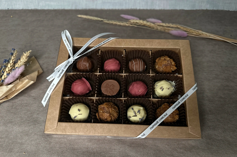 Ассорти из 12 сырных трюфелей — это гастрономическая дегустация в формате десерта. Смелые сочетания, баланс сладкого и солёного, фруктовая свежесть и благородная сырная глубина.