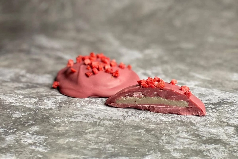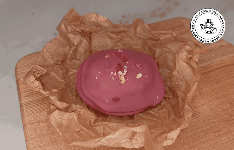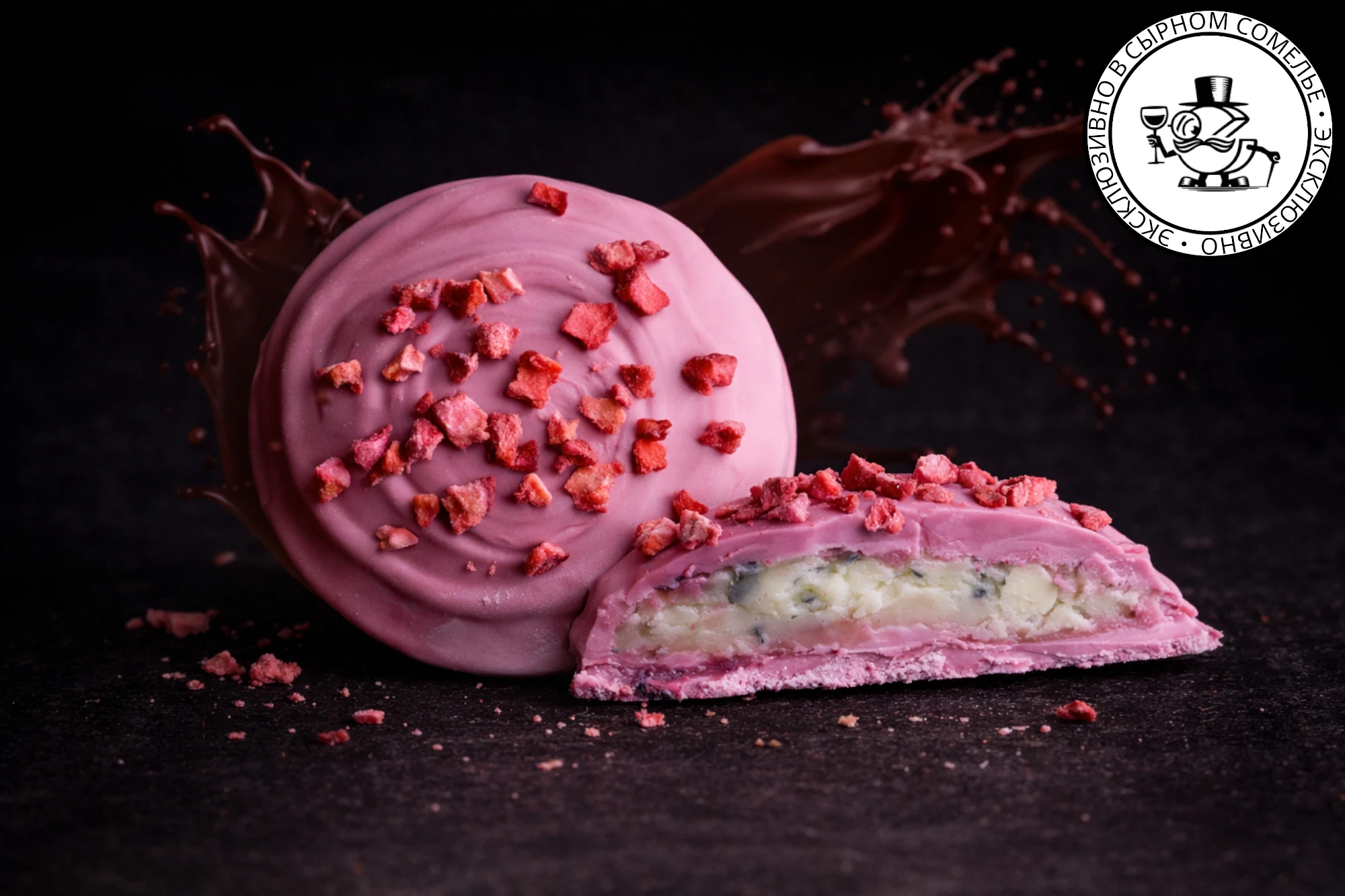 Сырный медиант «Клубника - Дорблю» изготовлен вручную из бельгийского шоколада Ruby, фруктовый оттенок которого гармонично сочетается с ярким вкусом сыра Дорблю и клубники.