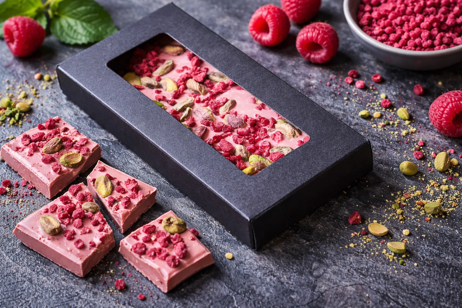 Руби «Фисташка–малина» изготовлен вручную из бельгийского шоколада на основе рубиновых какао-бобов. Его природный розовый оттенок и мягкий фруктовый вкус создают эффект «первого впечатления», которое остаётся надолго.