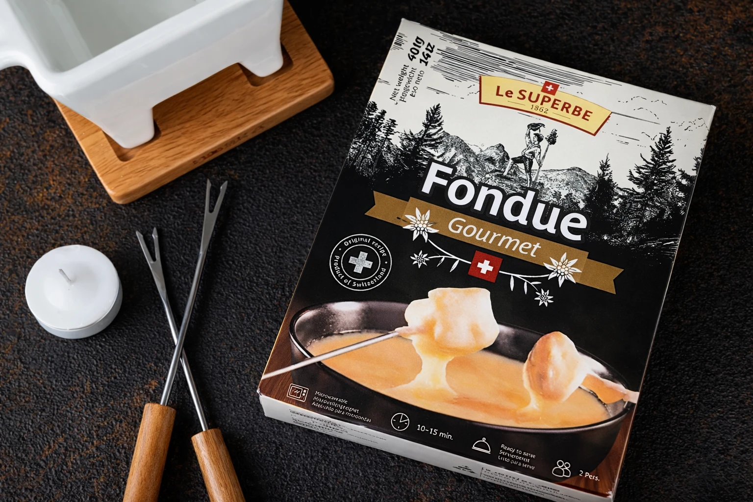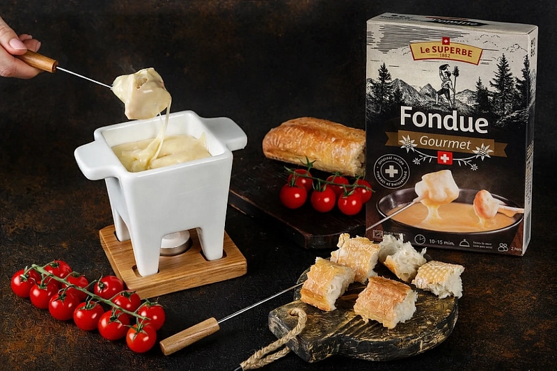 Фондю – это традиционное швейцарское блюдо, которым изначально питались, преимущественно, пастухи. Для того чтобы его приготовить, необходимо расплавить в котелке сыр и сдобрить его вином, специями и солью. При этом в получившуюся массу можно опускать как хлеб, так и овощи и даже фрукты. Данный сырный продукт вам достаточно будет только лишь разогреть, чтобы затем получить истинное наслаждение его пикантным вкусом. Внесите в свой вечер нотку швейцарской романтики, тепло и уют.