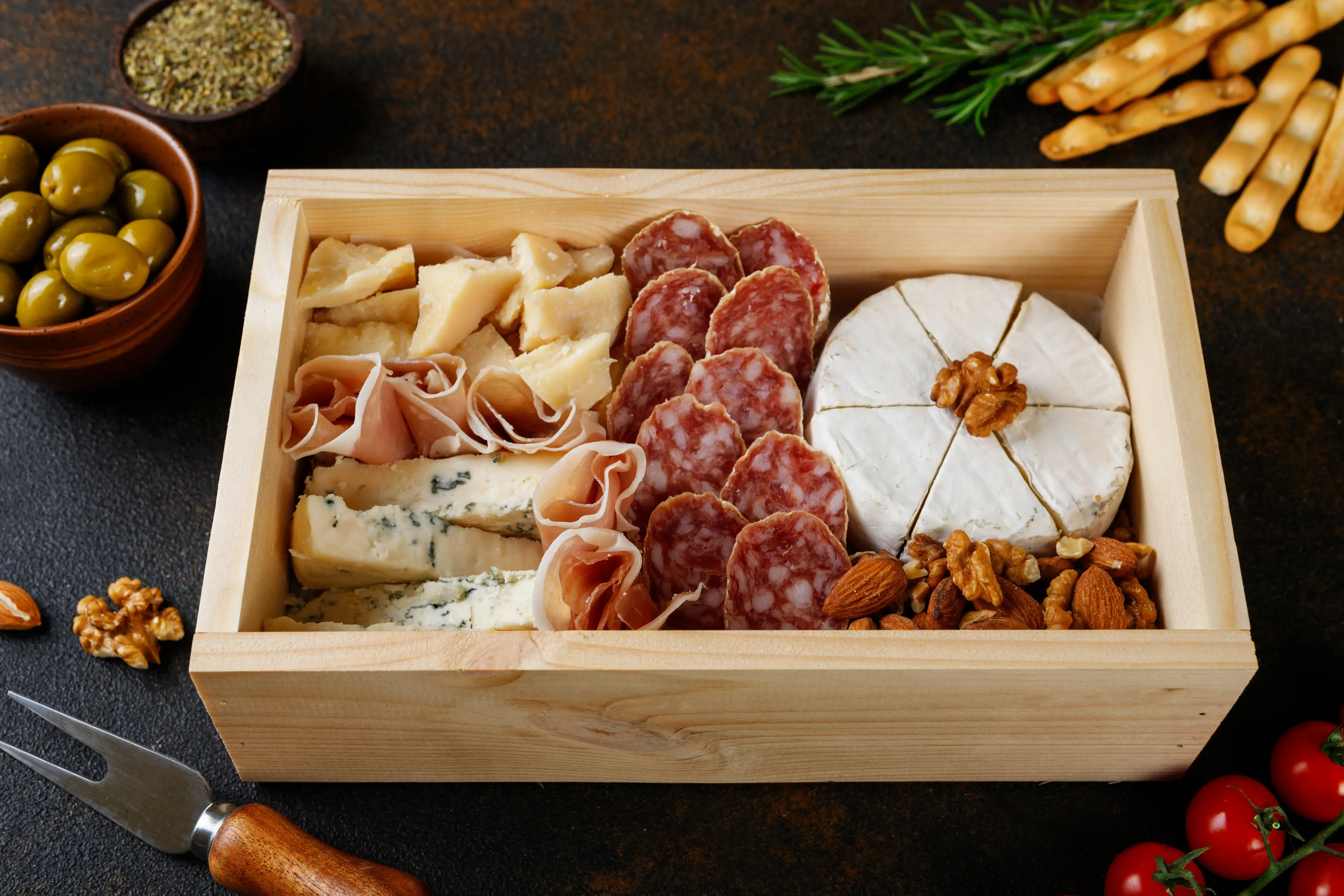 Мясной борд также дополняют сыры: