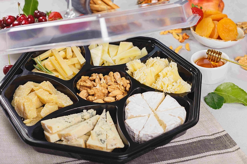 Сыры укладываются в менажницы с глубокими отсеками, которые не позволяют продукции перемешаться между собой.