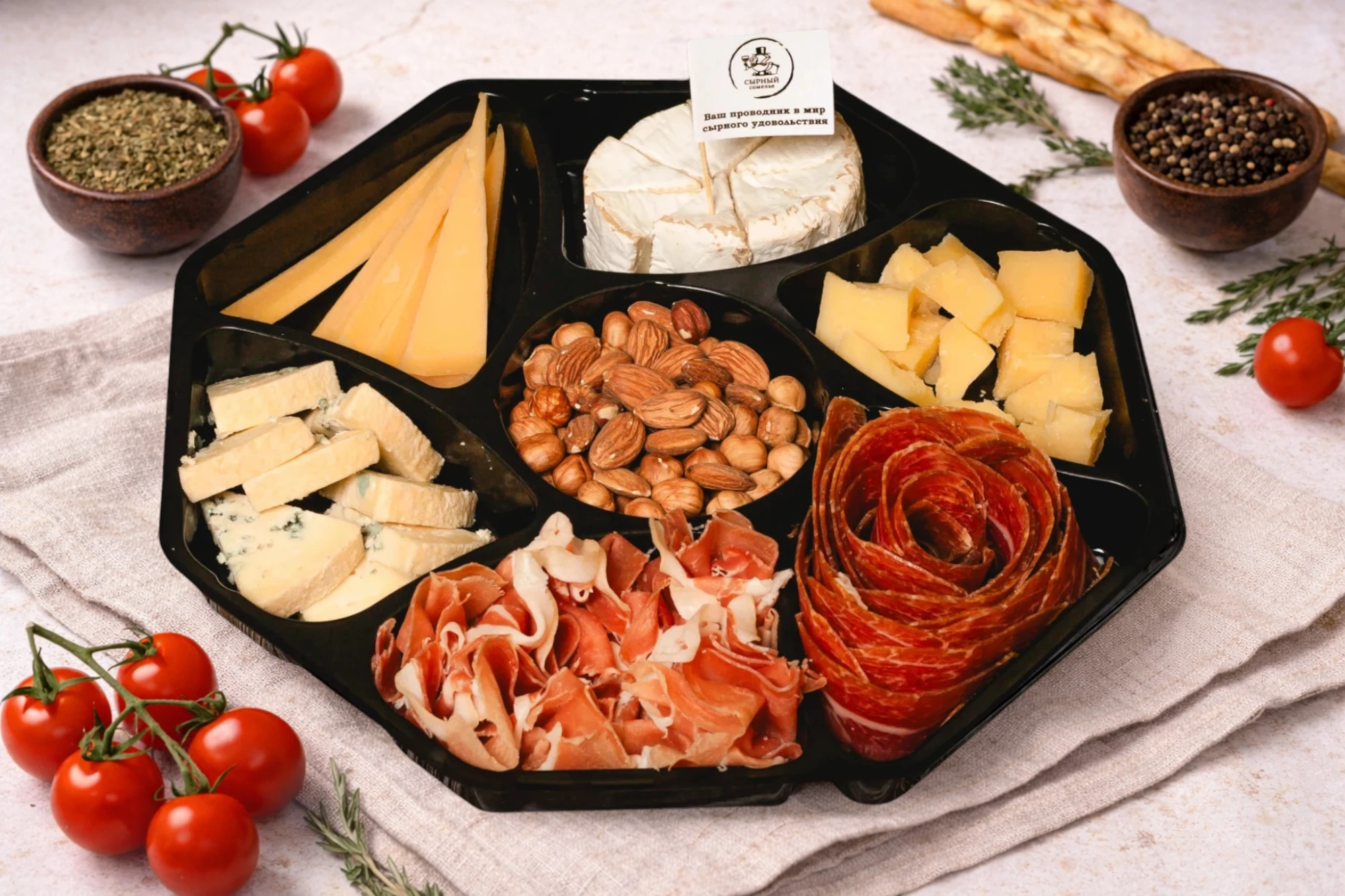 В дополнение к сырам вы найдете тонко нарезанное прошутто и хамон, которые добавят соленых нот, а хрустящие орехи завершат эту гармоничную композицию.