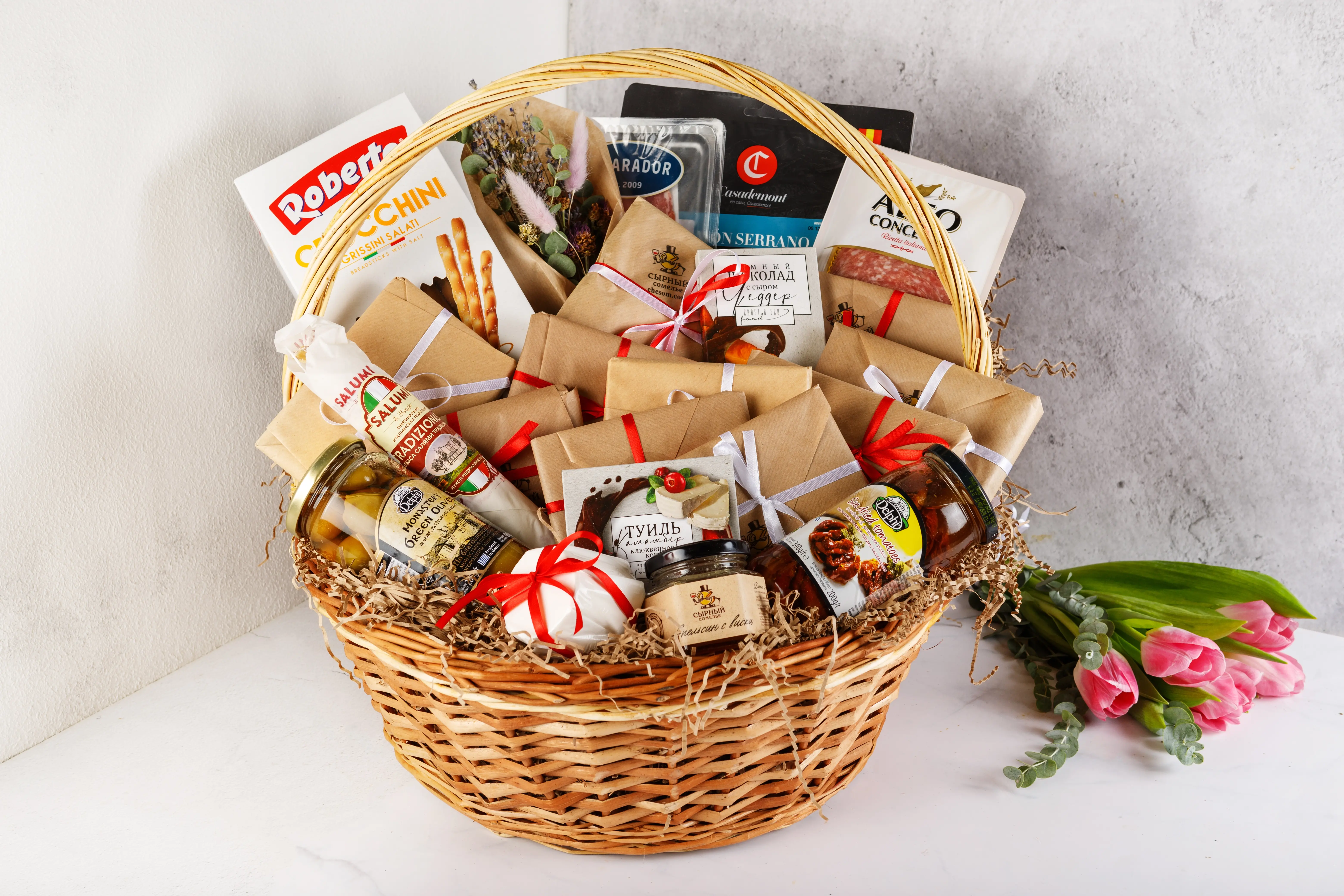 Набор приедет в изящной плетёной корзине, аккуратно упакованной в прозрачную плёнку.
