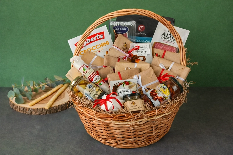 Перед вами премиальная корзина, где собрано всё лучшее: 12 видов сыров, большое дополнение в виде конфитюра, сырные конфеты, средиземноморские закуски и отборные мясные деликатесы.