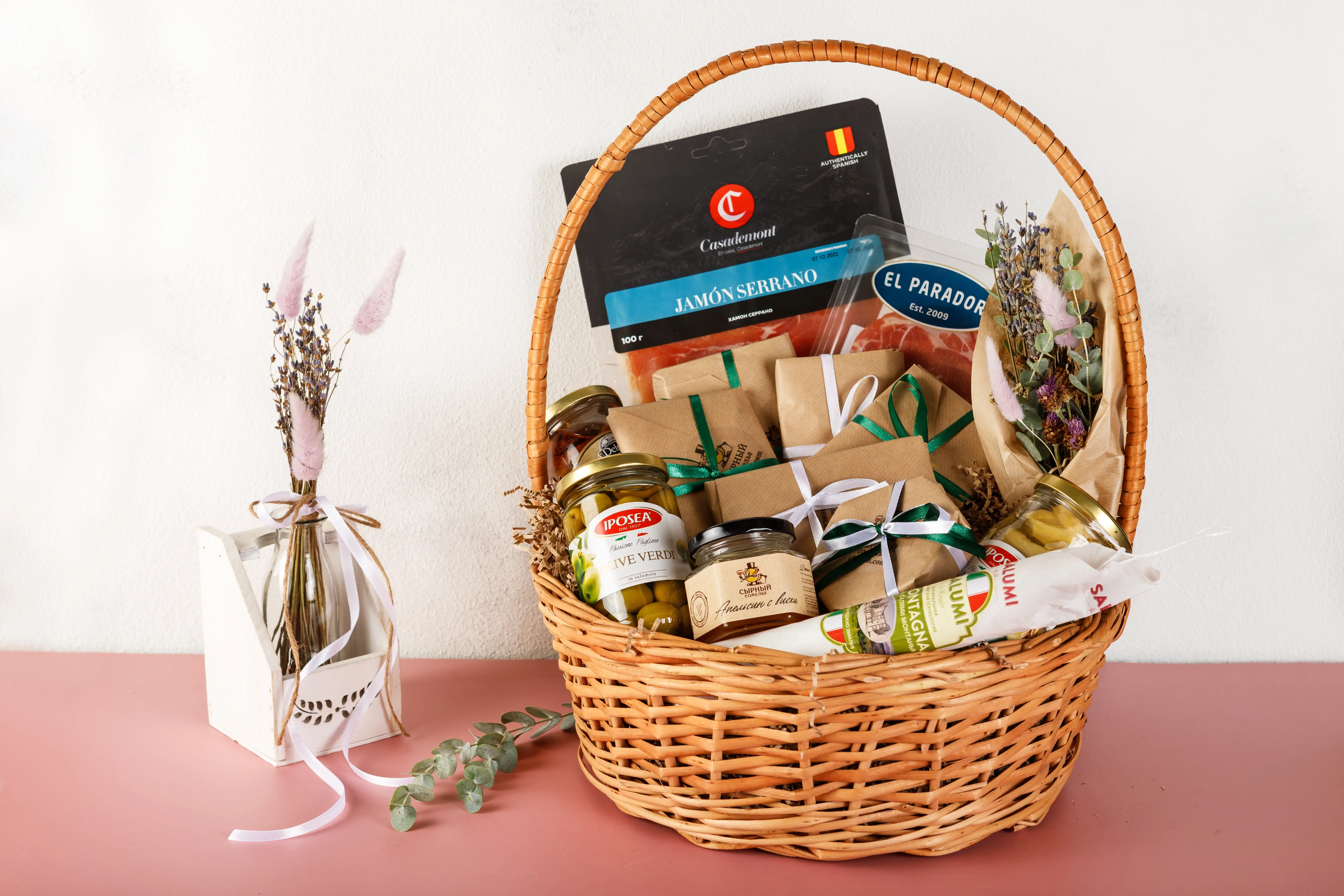 Внутри — шесть видов сыров, мясные деликатесы и целая коллекция средиземноморских закусок: артишоки, вяленые томаты, оливки и фруктовый конфитюр.