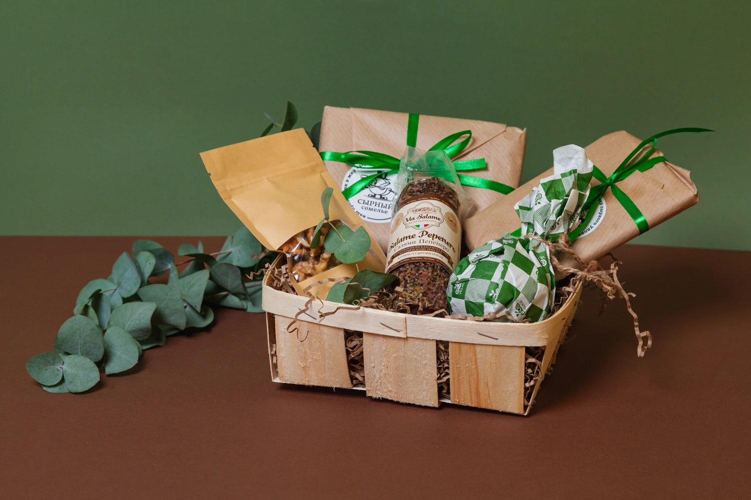 Набор приезжает в уютной плетёной шпонке, аккуратно упакованной в прозрачную плёнку — полностью готовый к вручению.