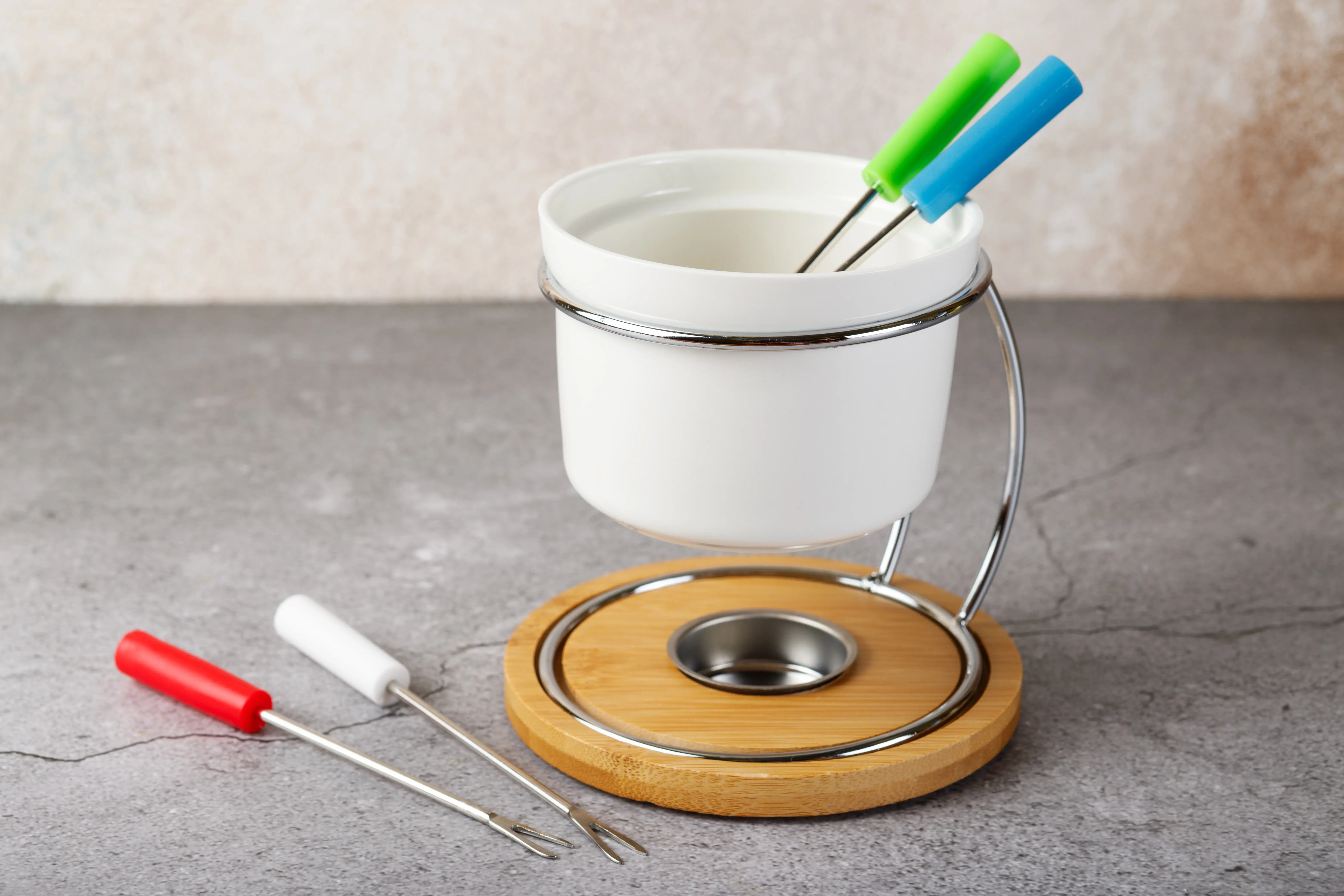 Набор для фондю состоит из керамической чаши и 4 шпажок.